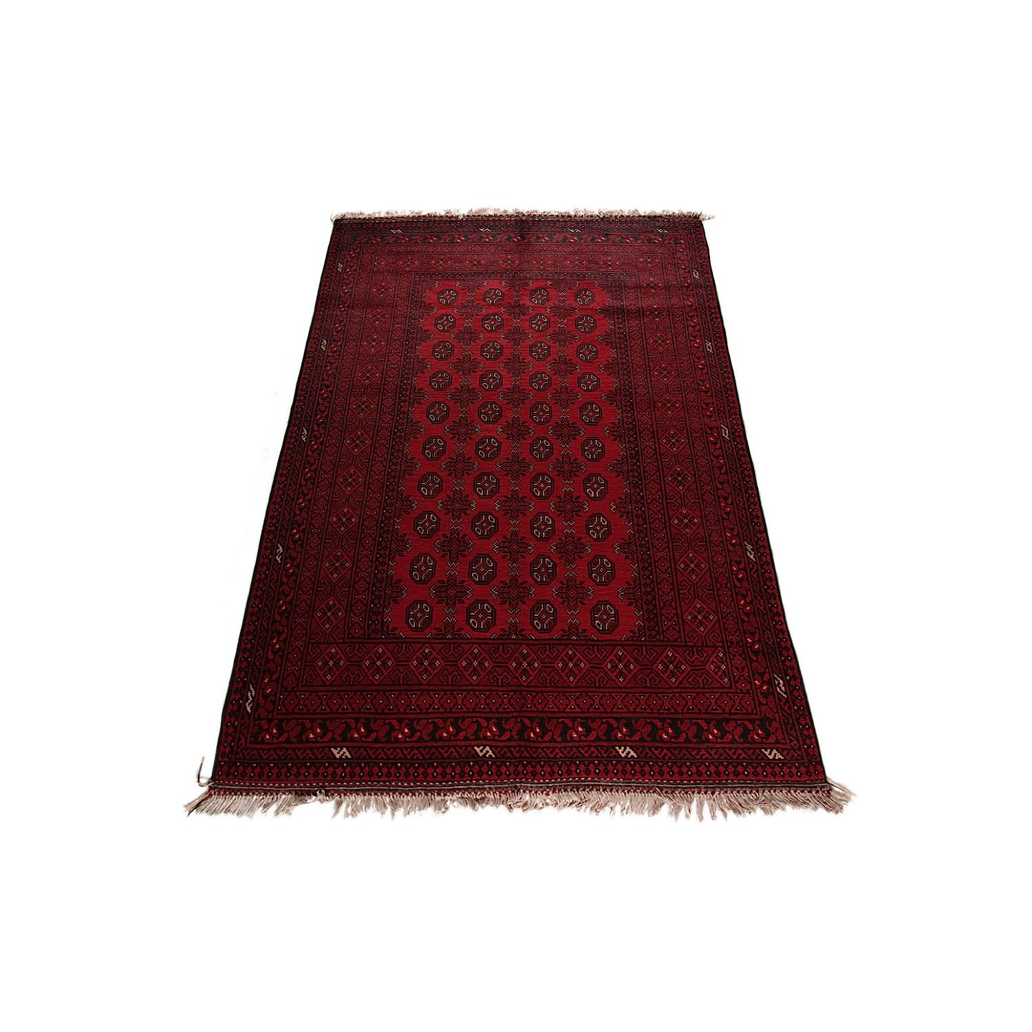 These are handmade carpets produced in Afghanistan by nomads. They are being woven traditionally with repeated patterns and are usually made in combinations of red, black and white colors. This family of carpets is manufactured by wool on wool and it has a red background color.