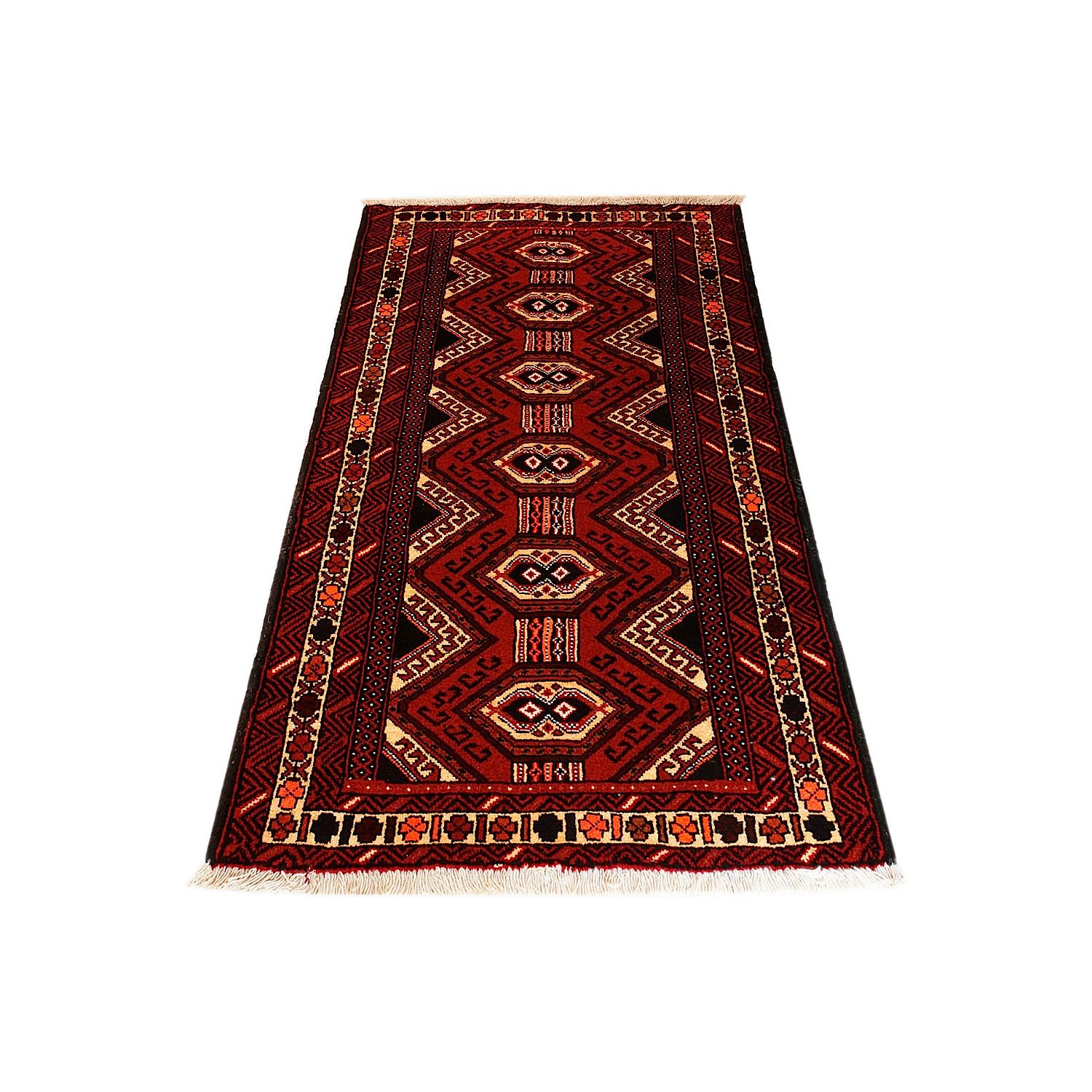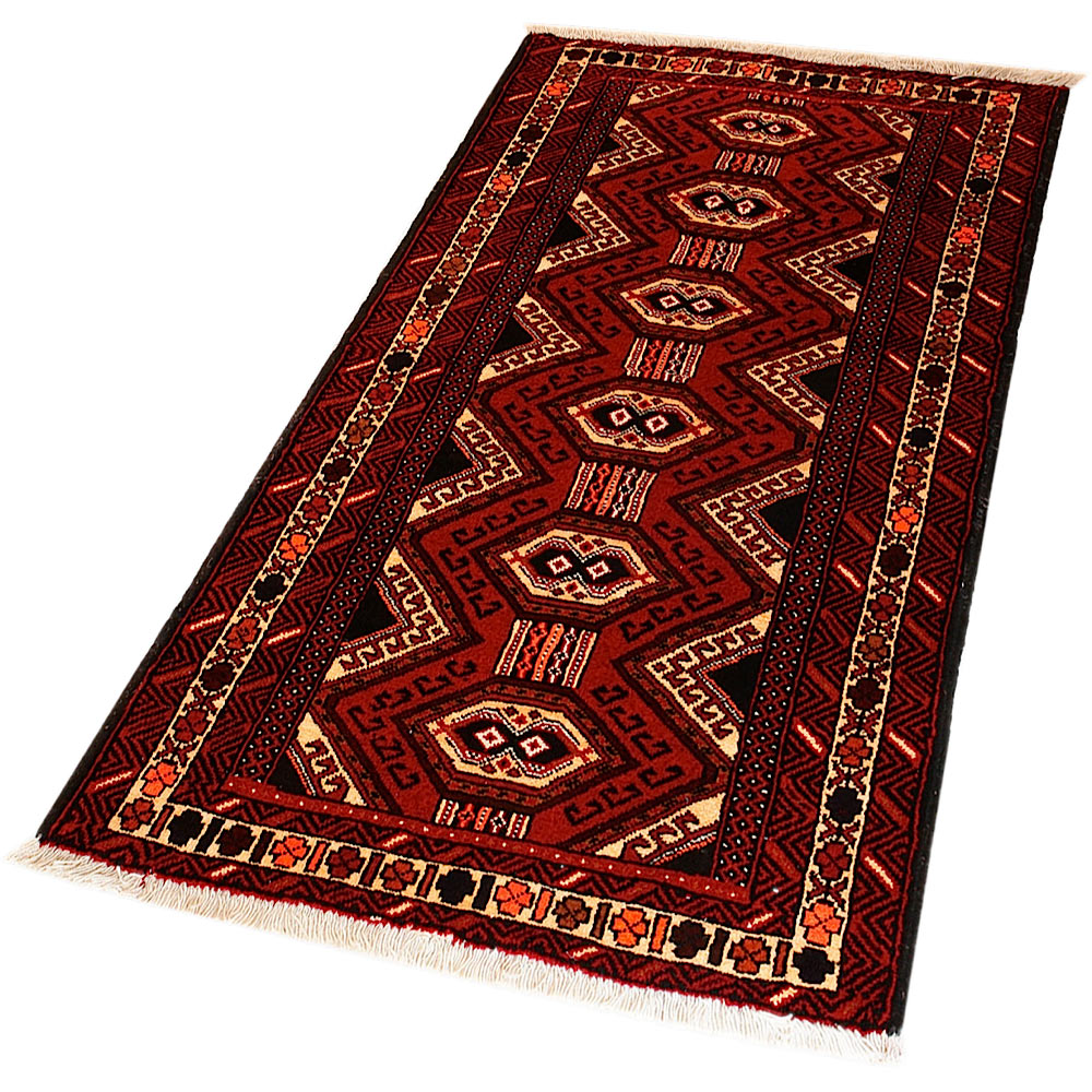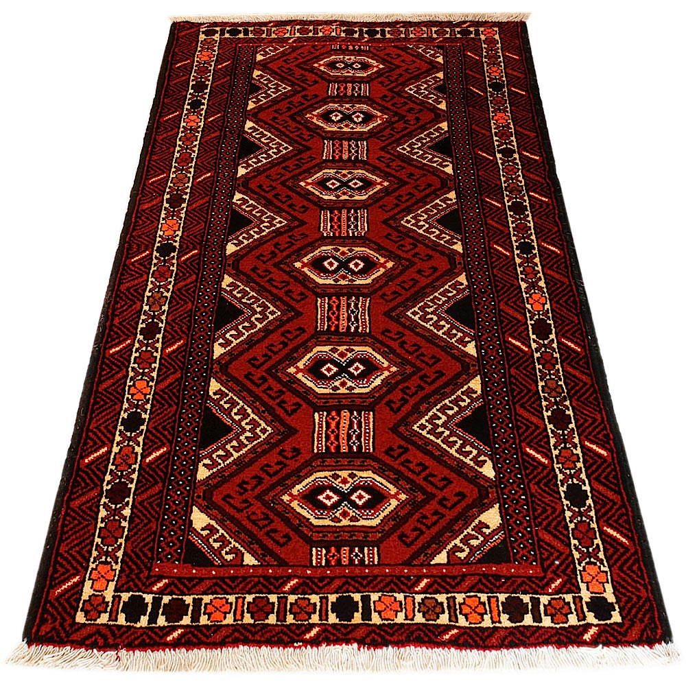 Baluch (or Baluchistan) is a region that includes the Baluchistan province in Pakistan as well as parts of Iran and Afghanistan. These very durable carpets are called Baluchi / Beluchi / Balochi since they are made in this border region; they are usually made of 100% wool and in small sizes, and feature dark red and brown colours and repetitive forms, usually the "gkiua" pattern.