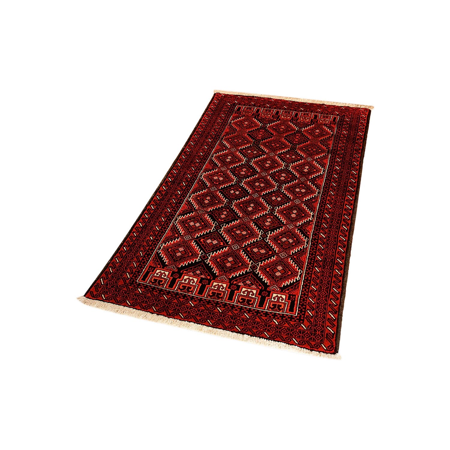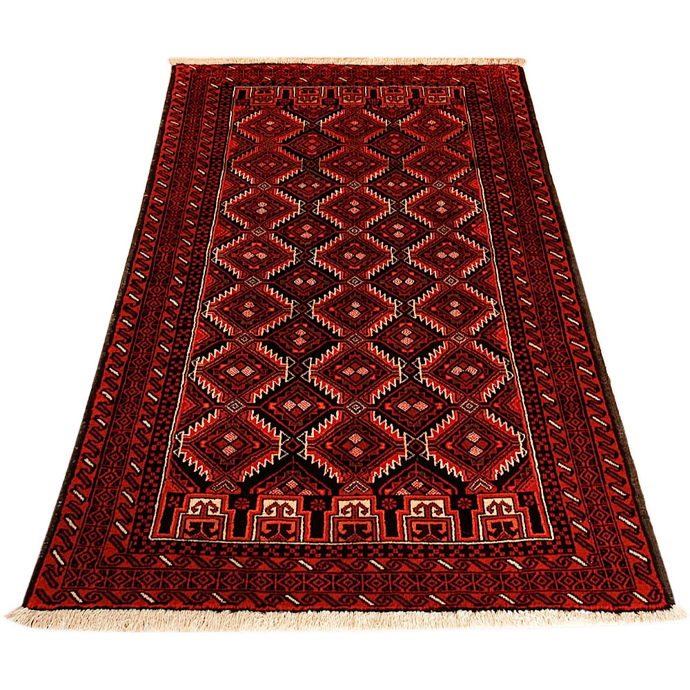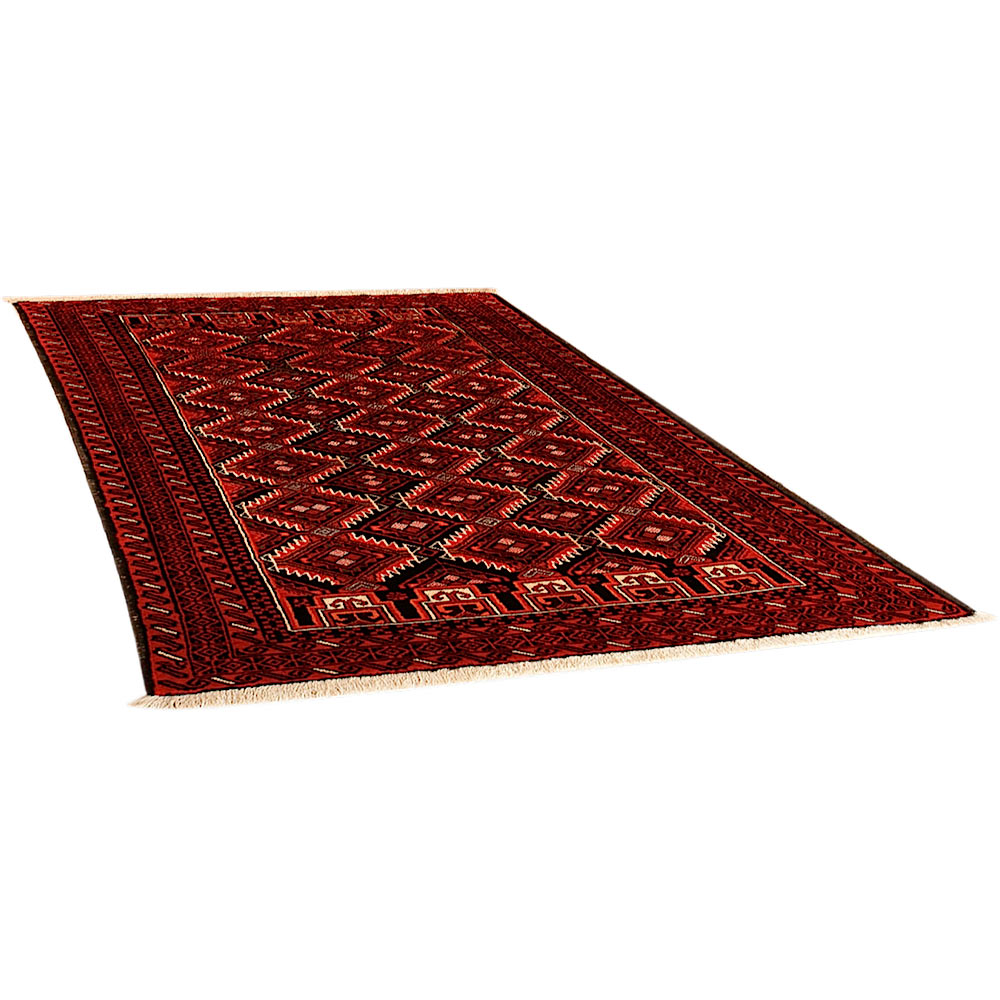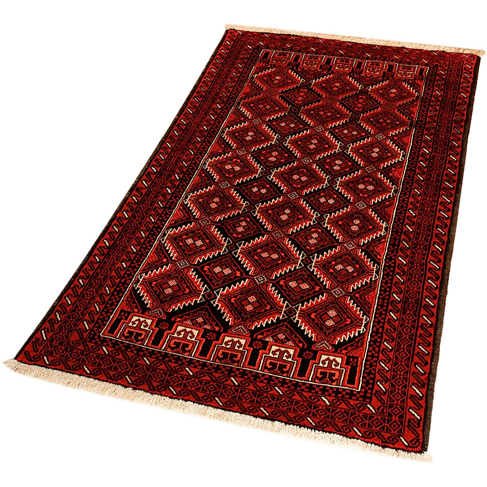 Baluch (or Baluchistan) is a region that includes the Baluchistan province in Pakistan as well as parts of Iran and Afghanistan. These very durable carpets are called Baluchi / Beluchi / Balochi since they are made in this border region; they are usually made of 100% wool and in small sizes, and feature dark red and brown colours and repetitive forms, usually the "gkiua" pattern.