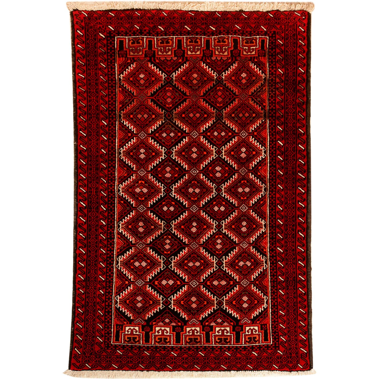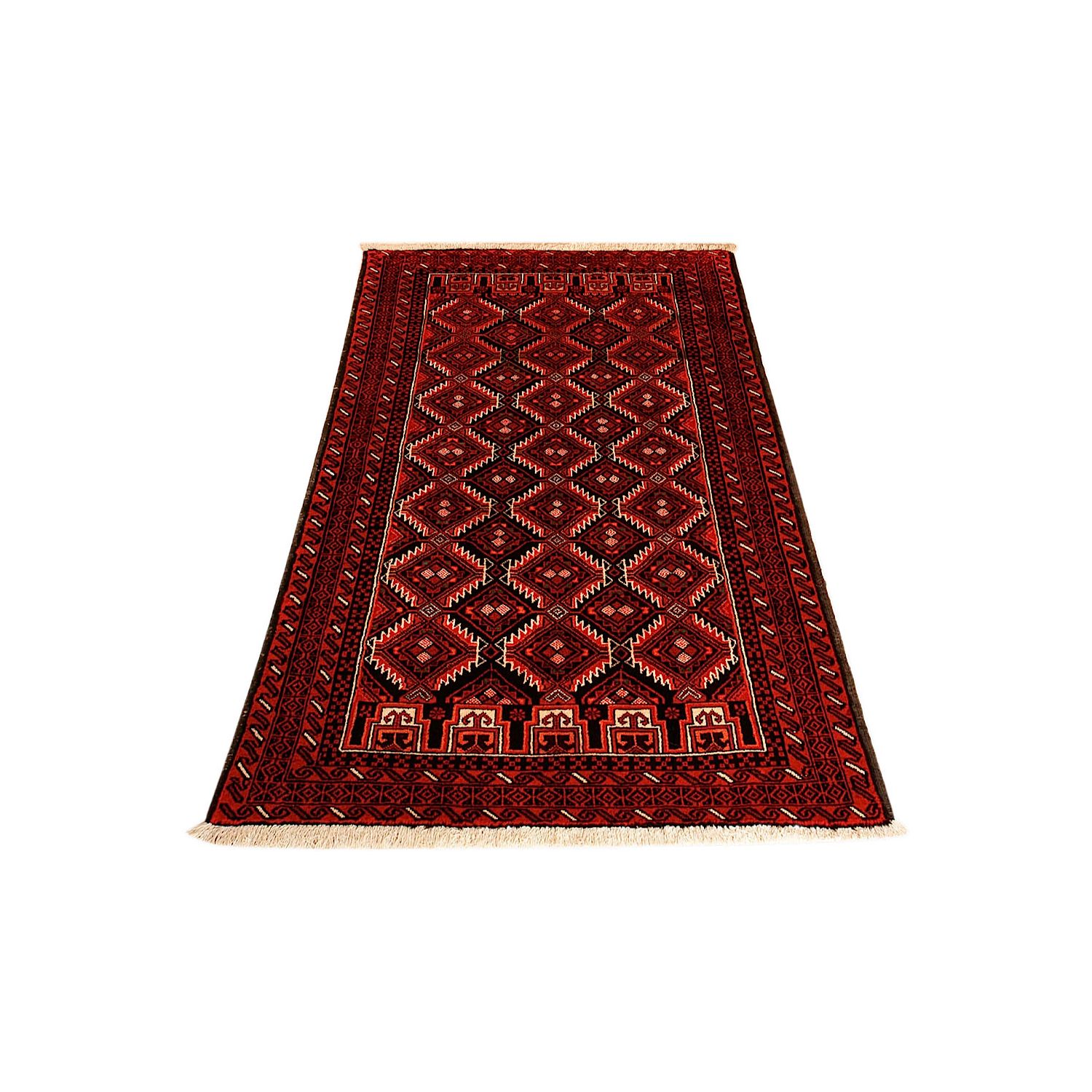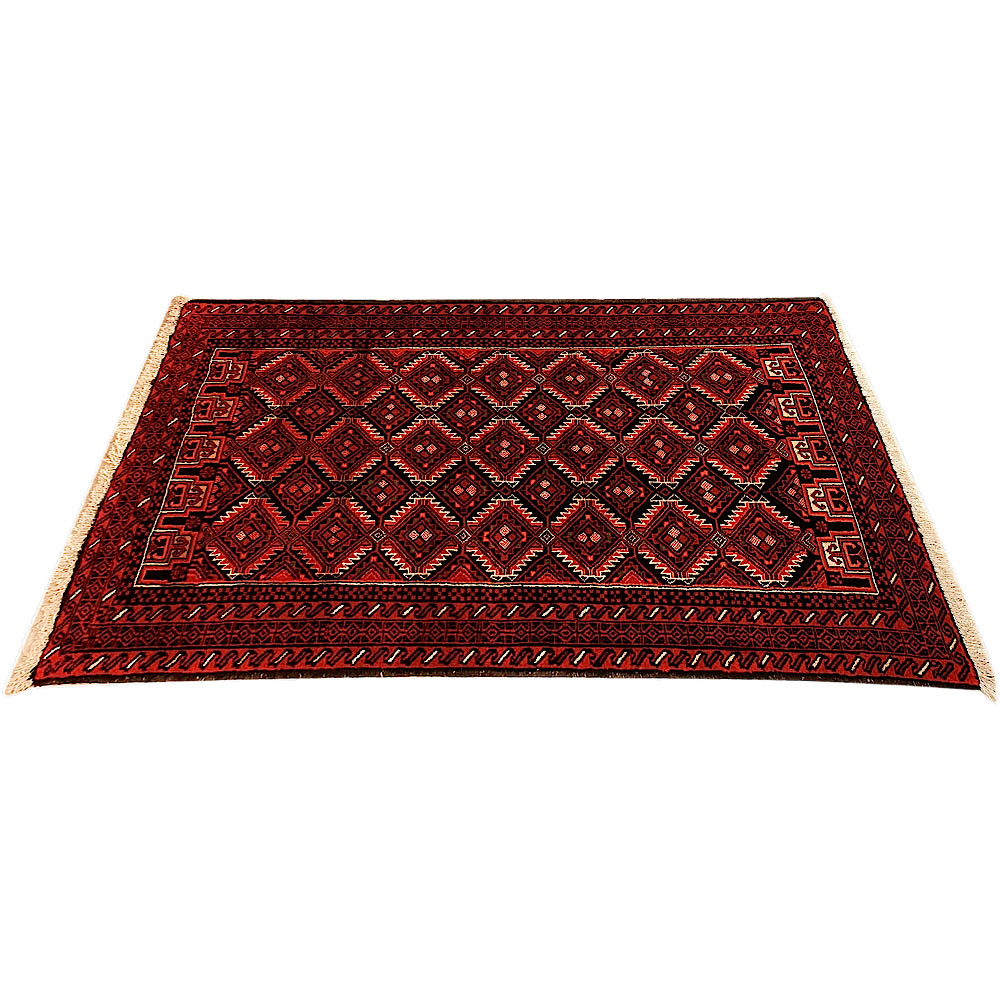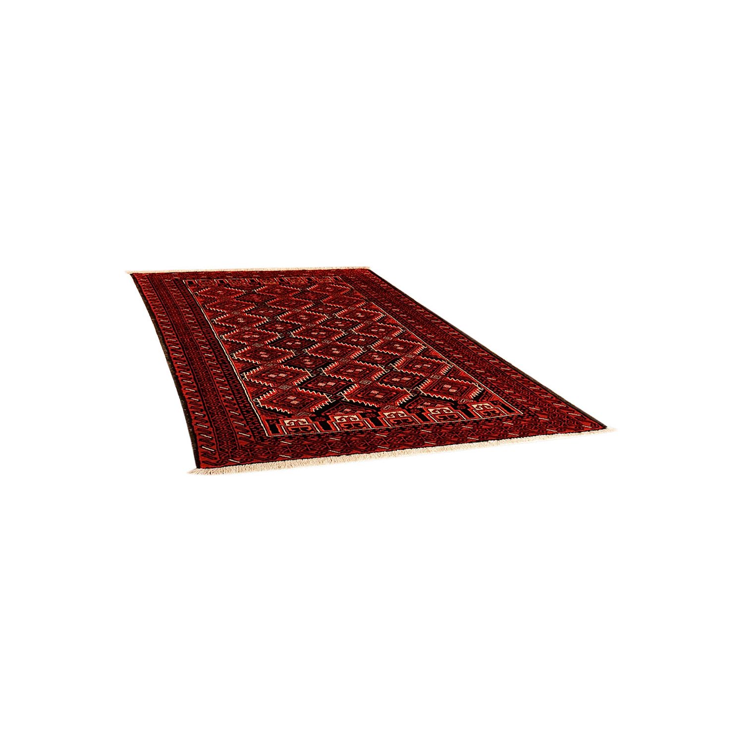 Baluch (or Baluchistan) is a region that includes the Baluchistan province in Pakistan as well as parts of Iran and Afghanistan. These very durable carpets are called Baluchi / Beluchi / Balochi since they are made in this border region; they are usually made of 100% wool and in small sizes, and feature dark red and brown colours and repetitive forms, usually the "gkiua" pattern.