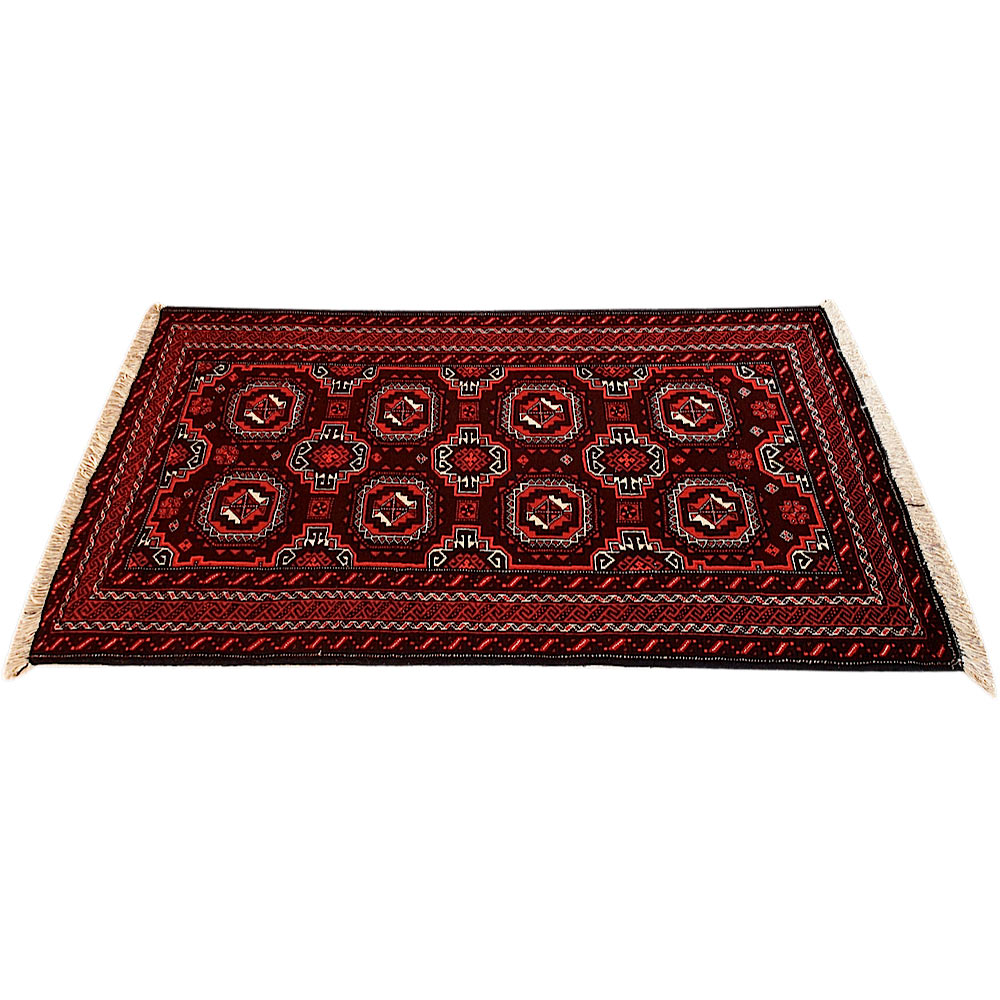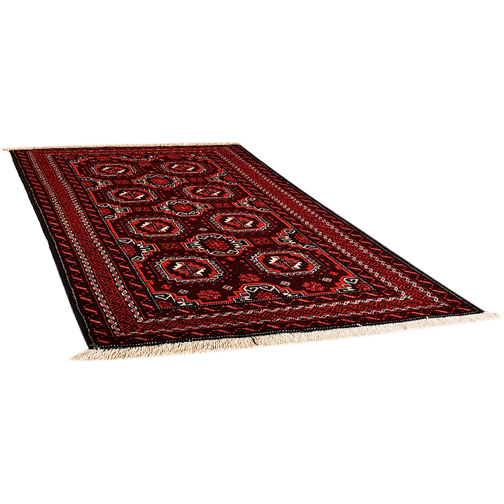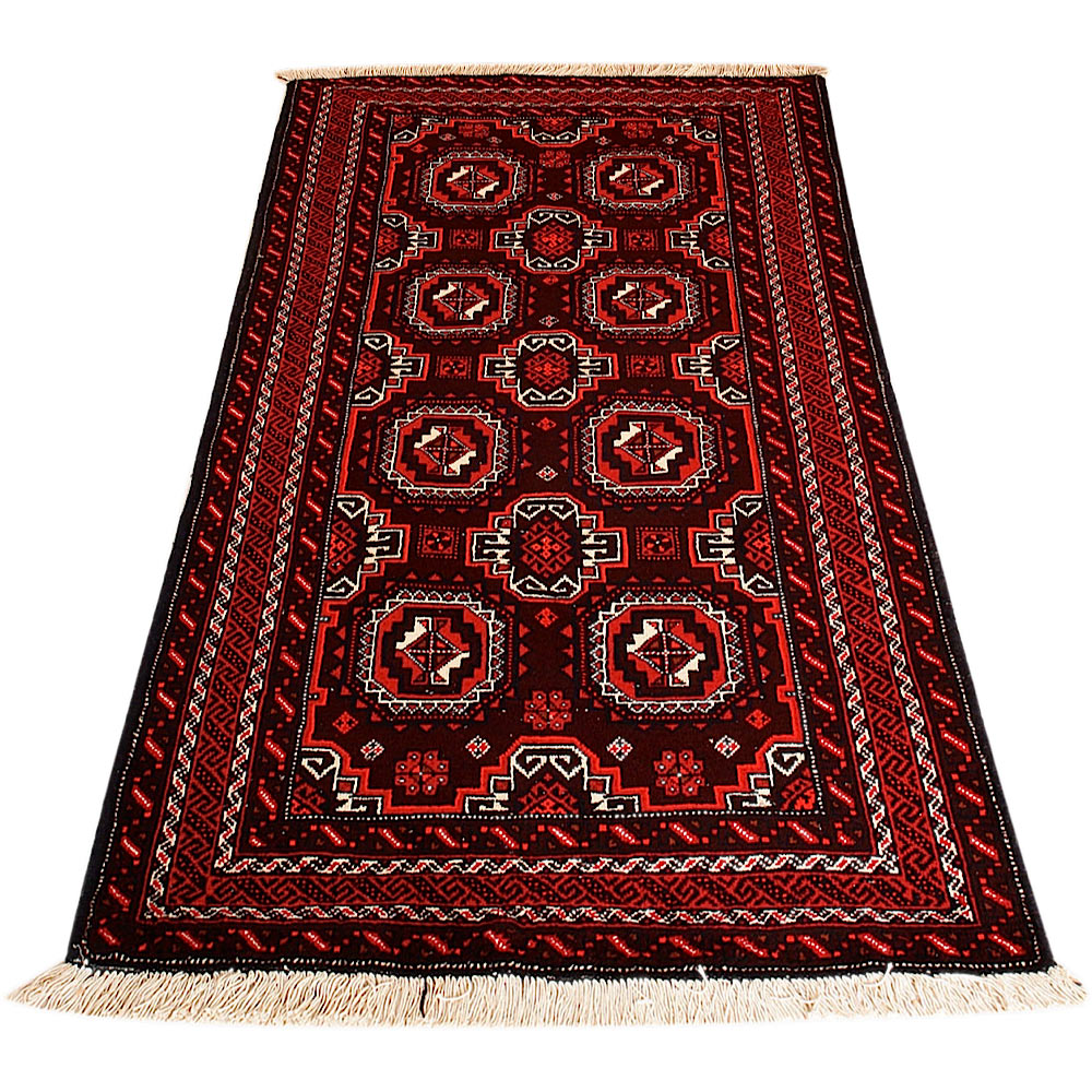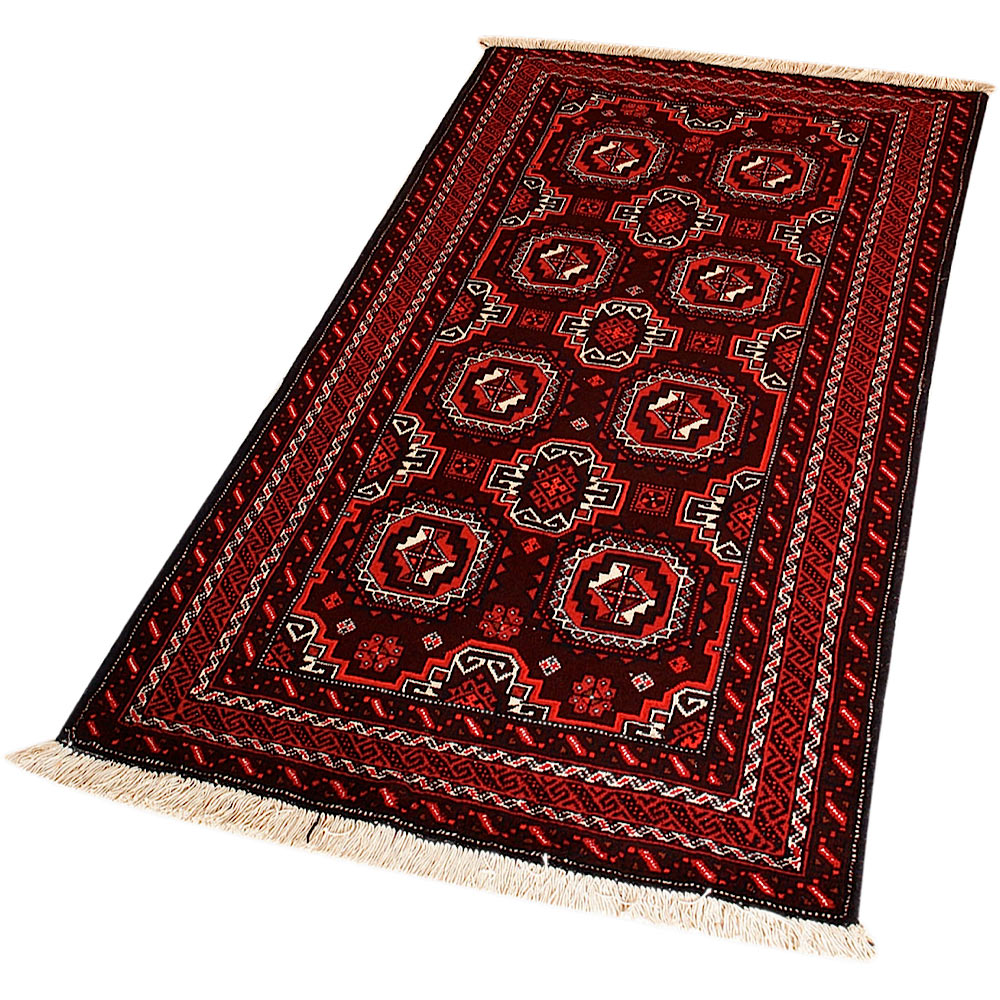 Baluch (or Baluchistan) is a region that includes the Baluchistan province in Pakistan as well as parts of Iran and Afghanistan. These very durable carpets are called Baluchi / Beluchi / Balochi since they are made in this border region; they are usually made of 100% wool and in small sizes, and feature dark red and brown colours and repetitive forms, usually the "gkiua" pattern.