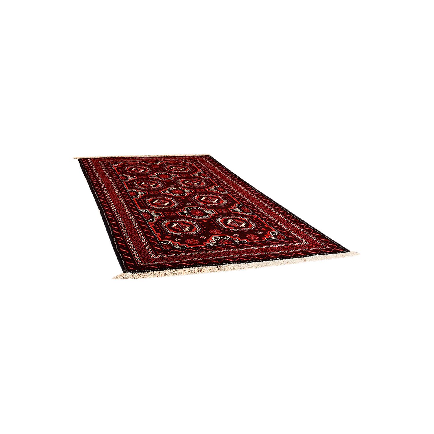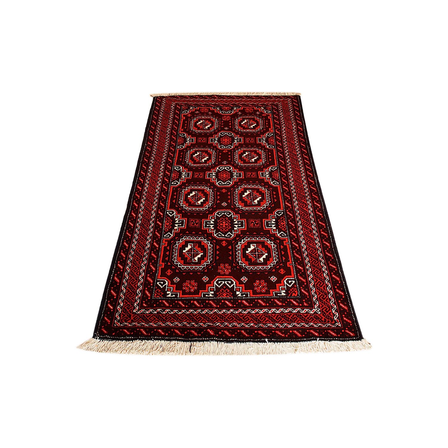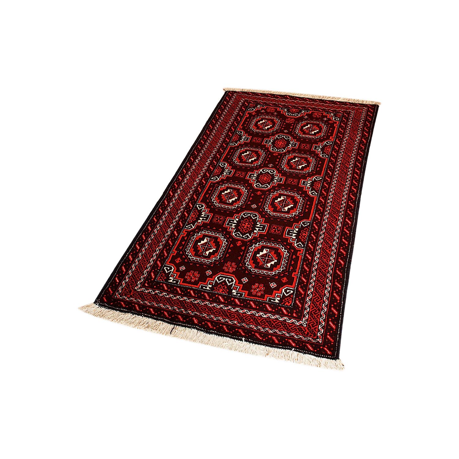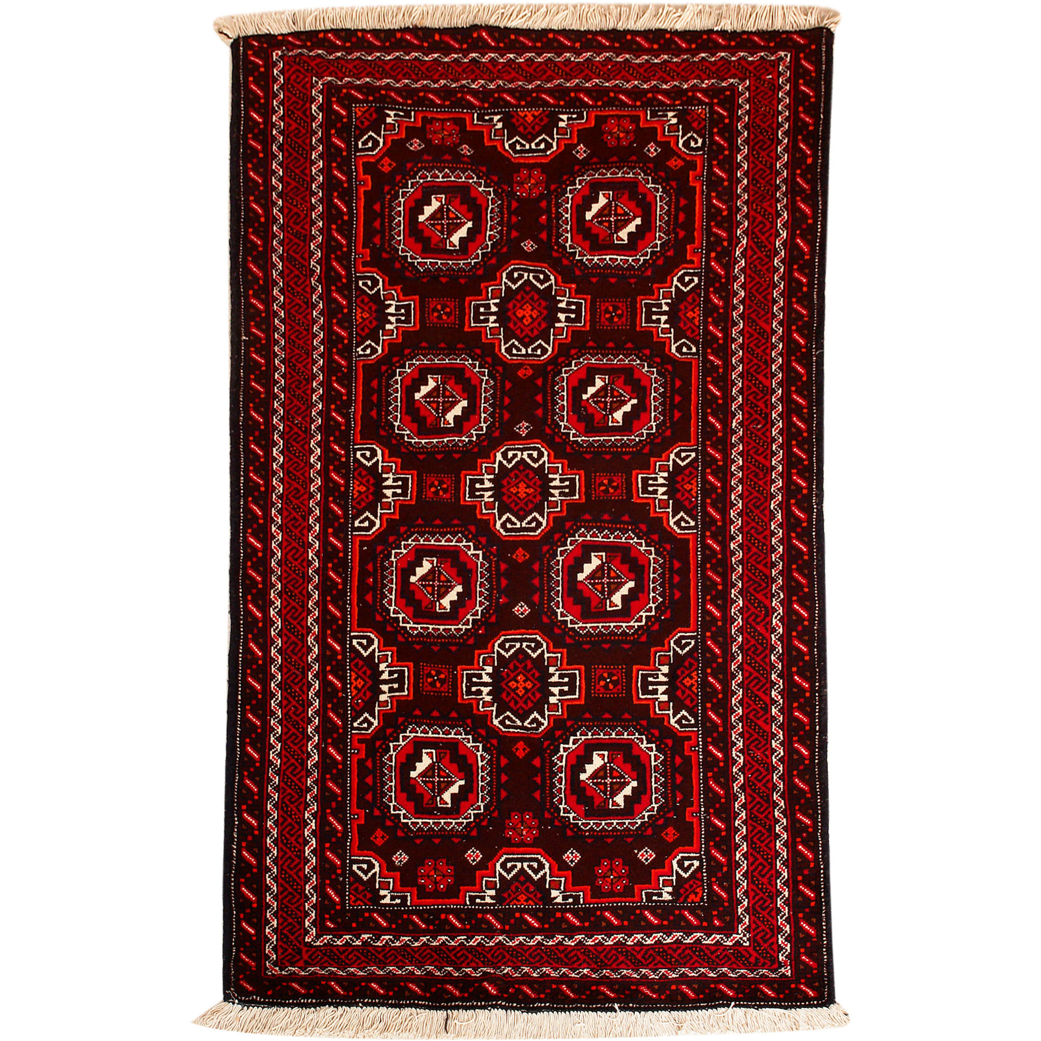 Baluch (or Baluchistan) is a region that includes the Baluchistan province in Pakistan as well as parts of Iran and Afghanistan. These very durable carpets are called Baluchi / Beluchi / Balochi since they are made in this border region; they are usually made of 100% wool and in small sizes, and feature dark red and brown colours and repetitive forms, usually the "gkiua" pattern.