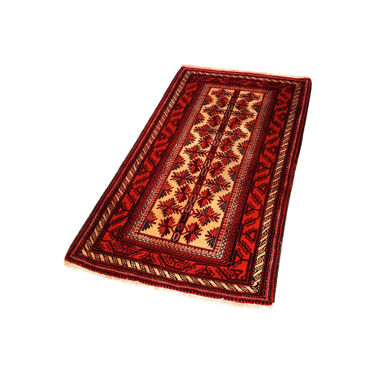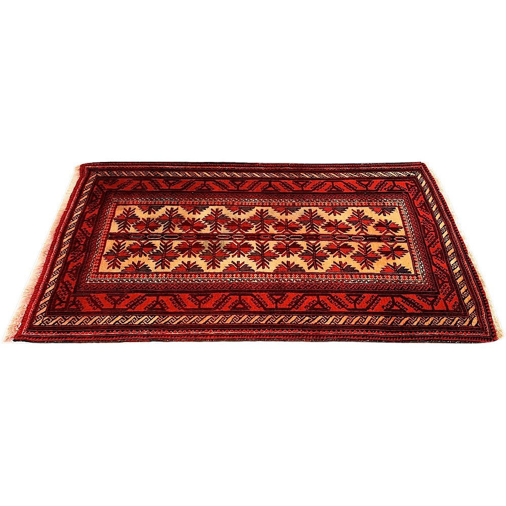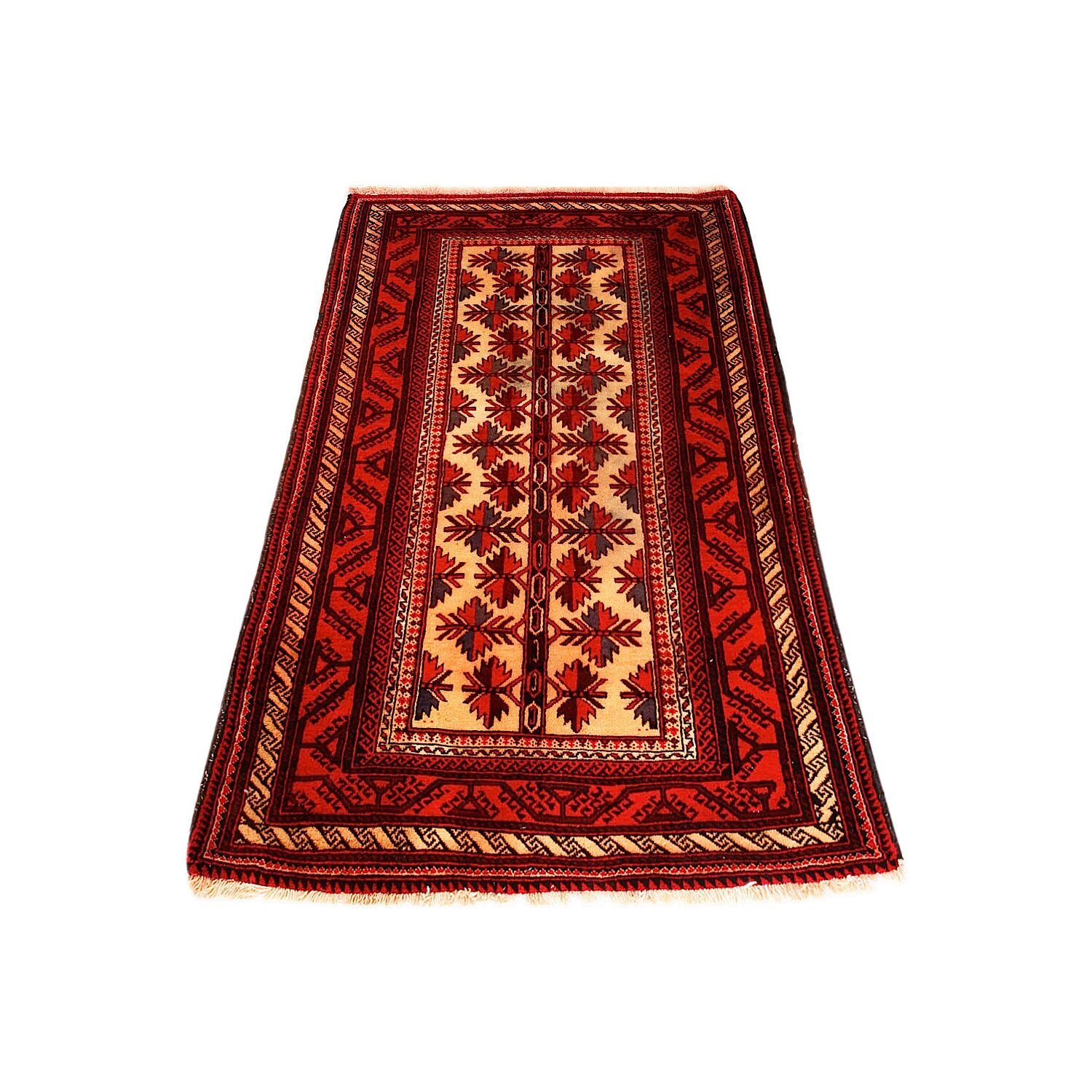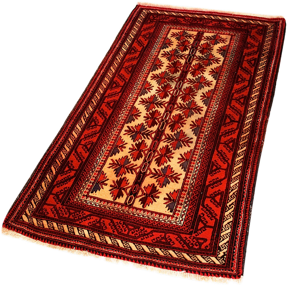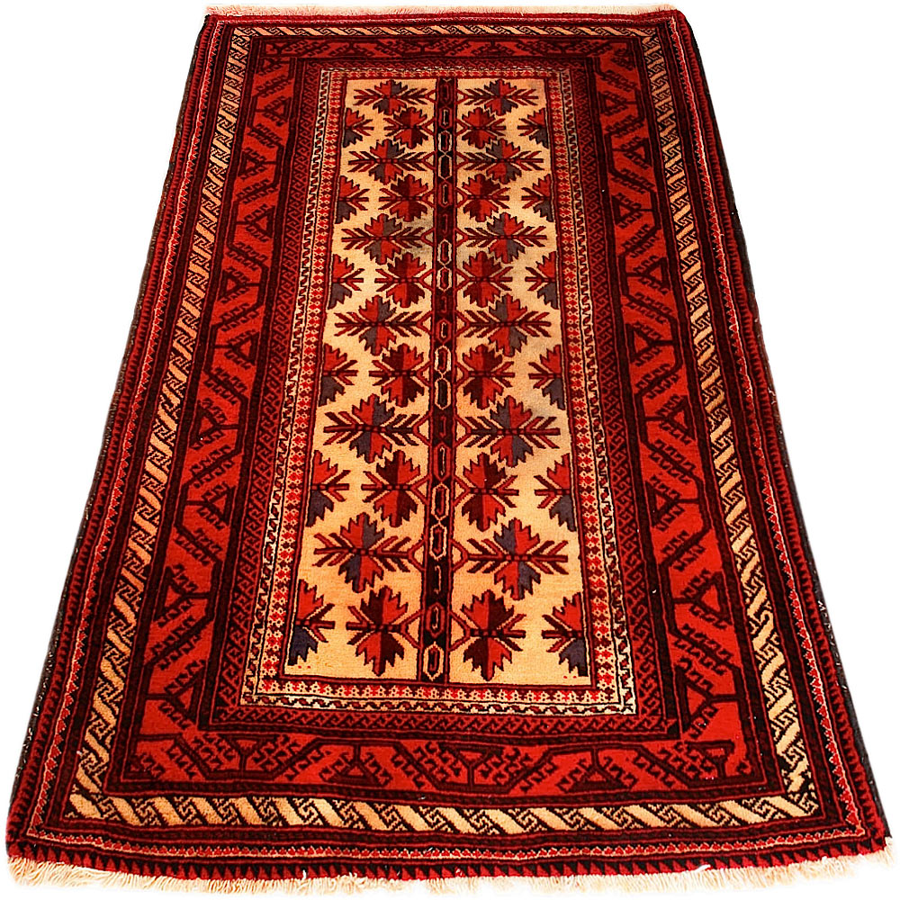 Baluch (or Baluchistan) is a region that includes the Baluchistan province in Pakistan as well as parts of Iran and Afghanistan. These very durable carpets are called Baluchi / Beluchi / Balochi since they are made in this border region; they are usually made of 100% wool and in small sizes, and feature dark red and brown colours and repetitive forms, usually the "gkiua" pattern.