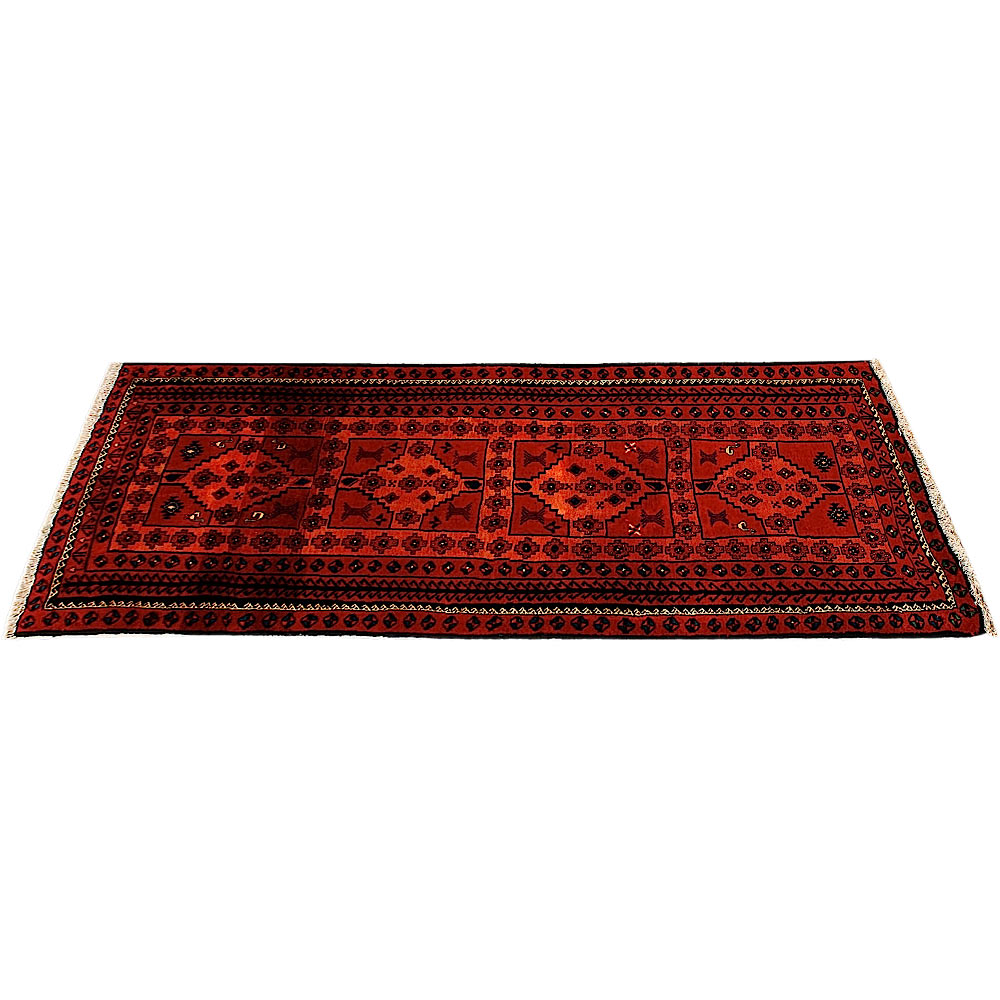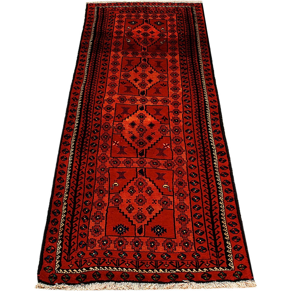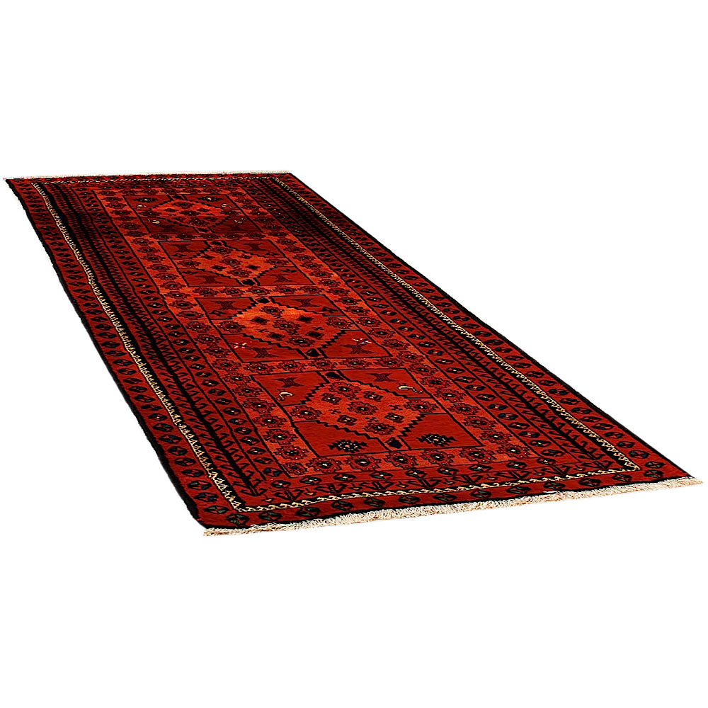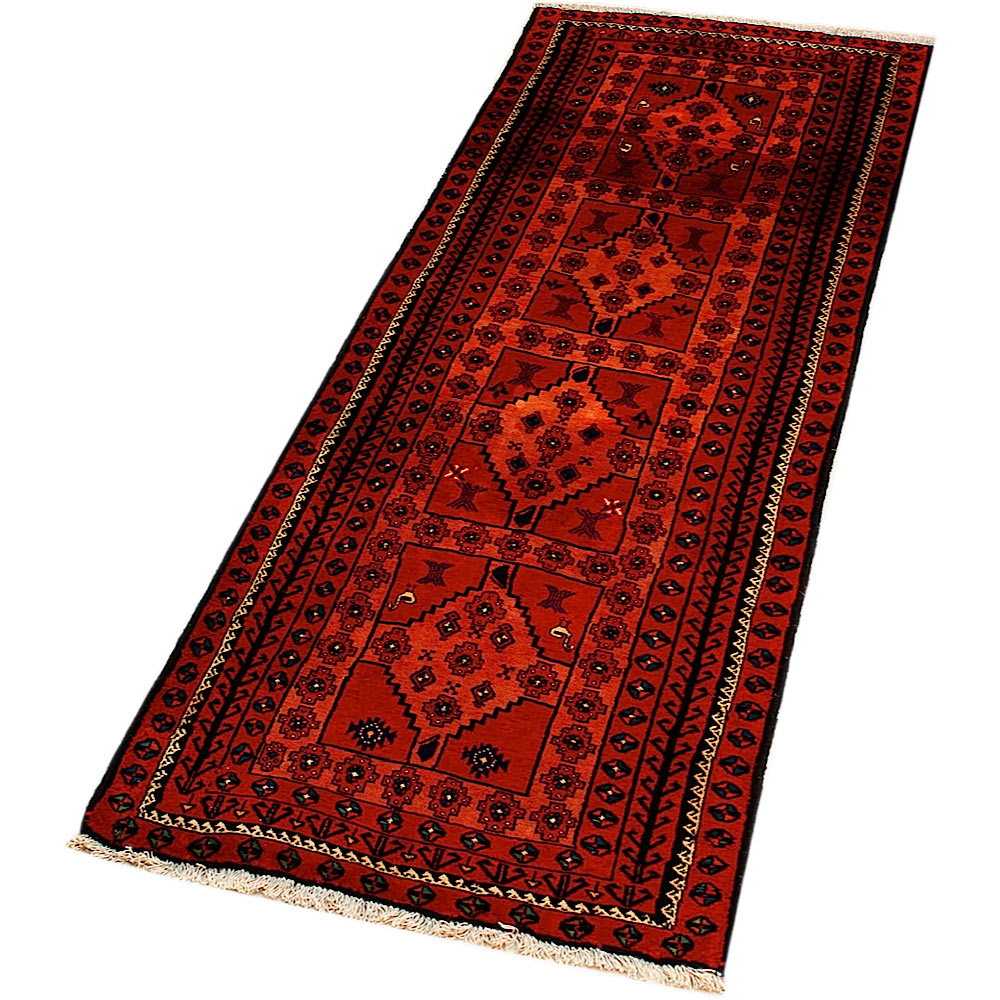 Baluch (or Baluchistan) is a region that includes the Baluchistan province in Pakistan as well as parts of Iran and Afghanistan. These very durable carpets are called Baluchi / Beluchi / Balochi since they are made in this border region; they are usually made of 100% wool and in small sizes, and feature dark red and brown colours and repetitive forms, usually the "gkiua" pattern.