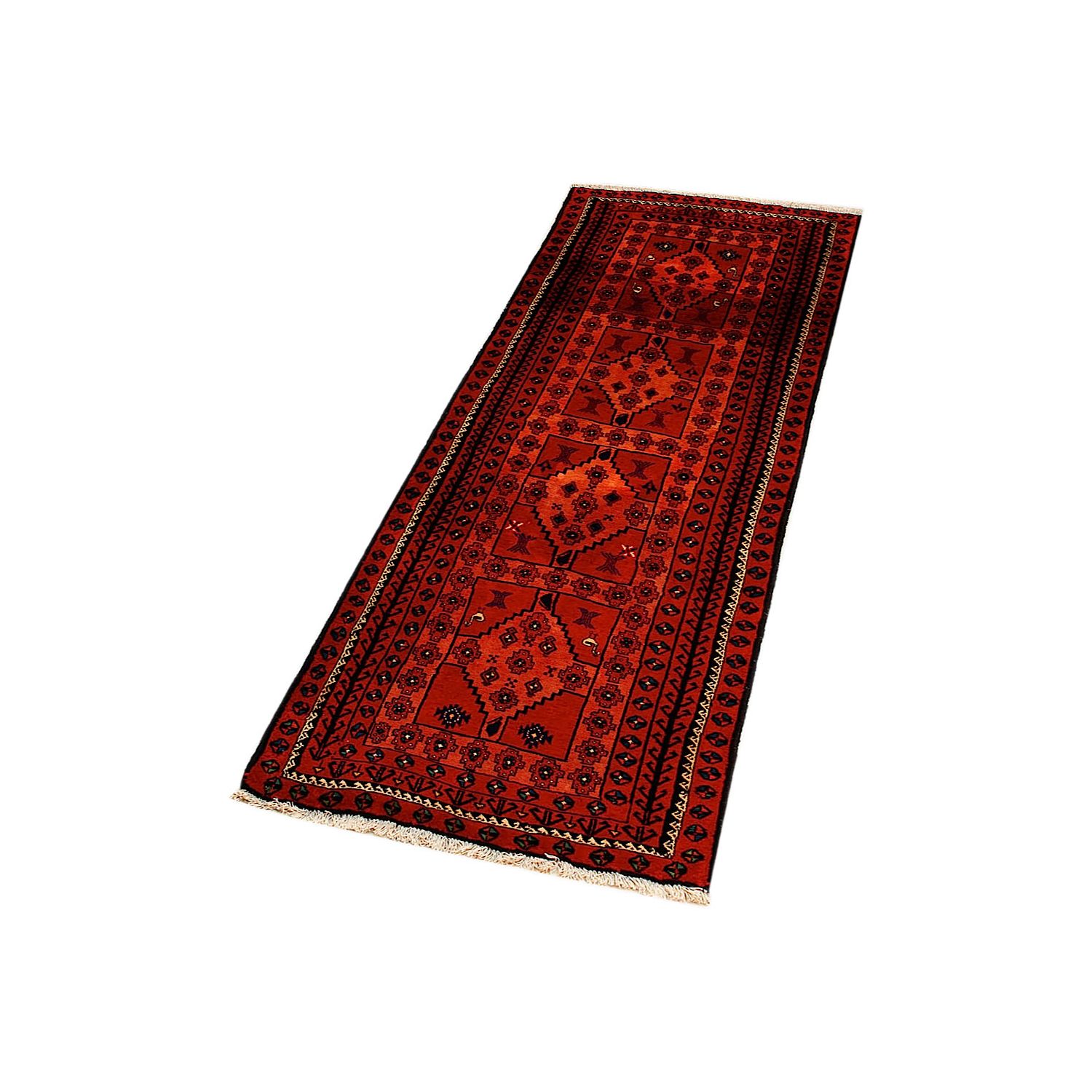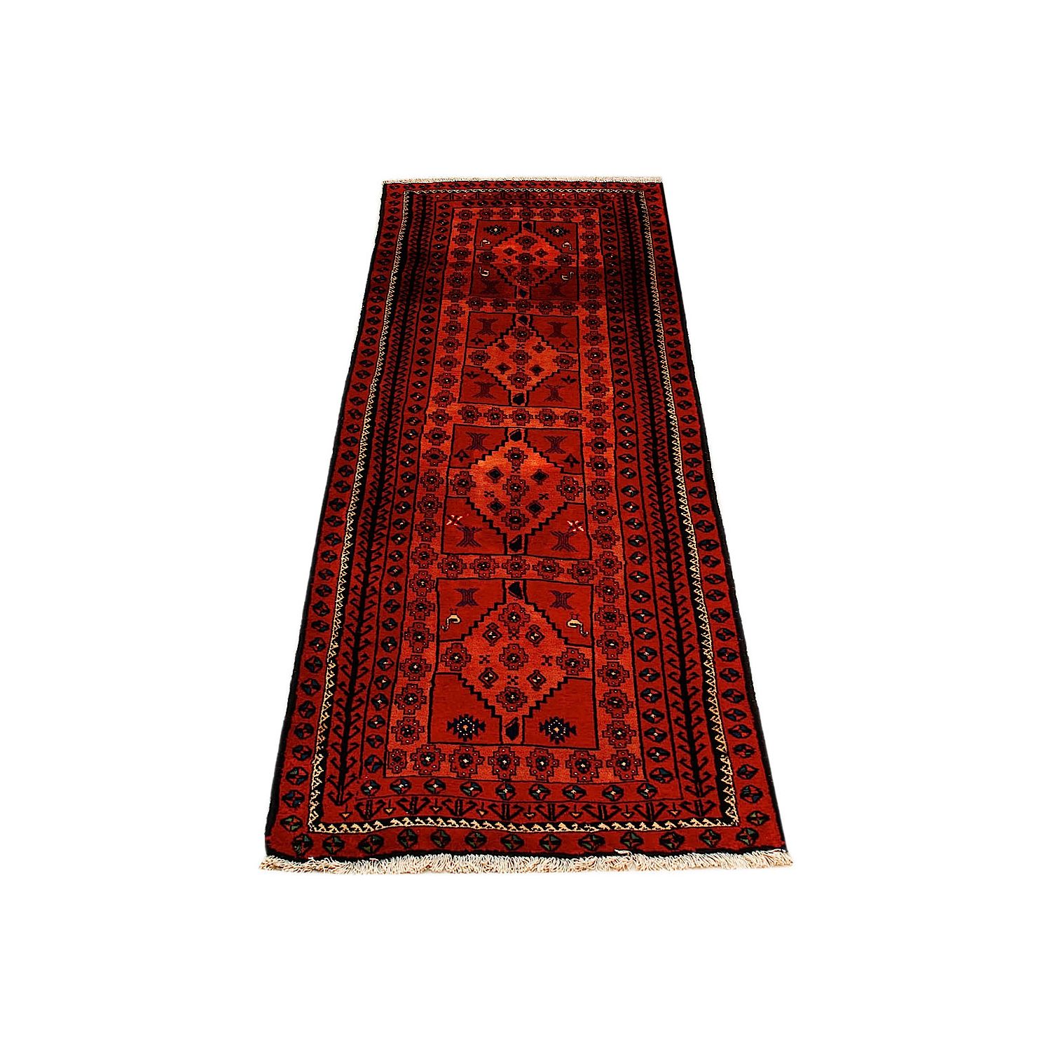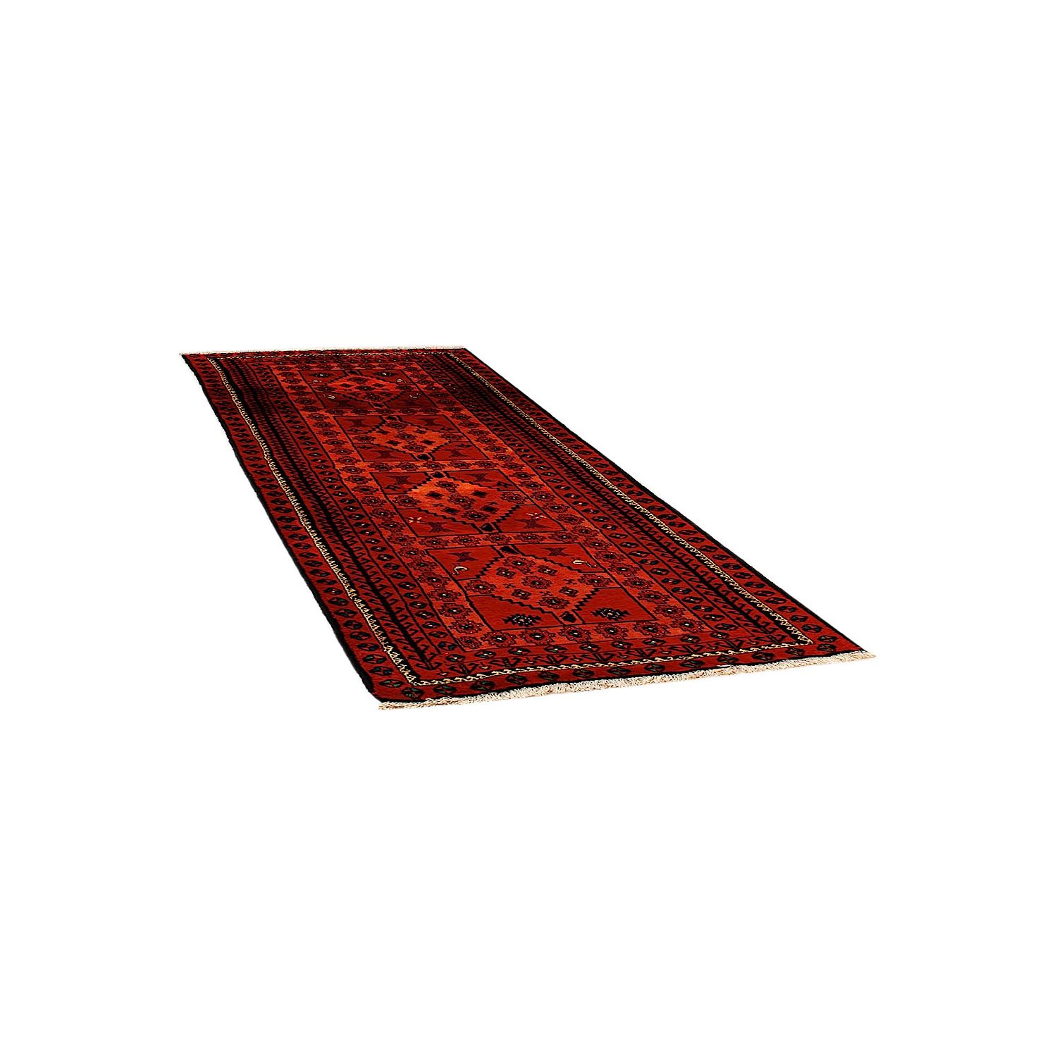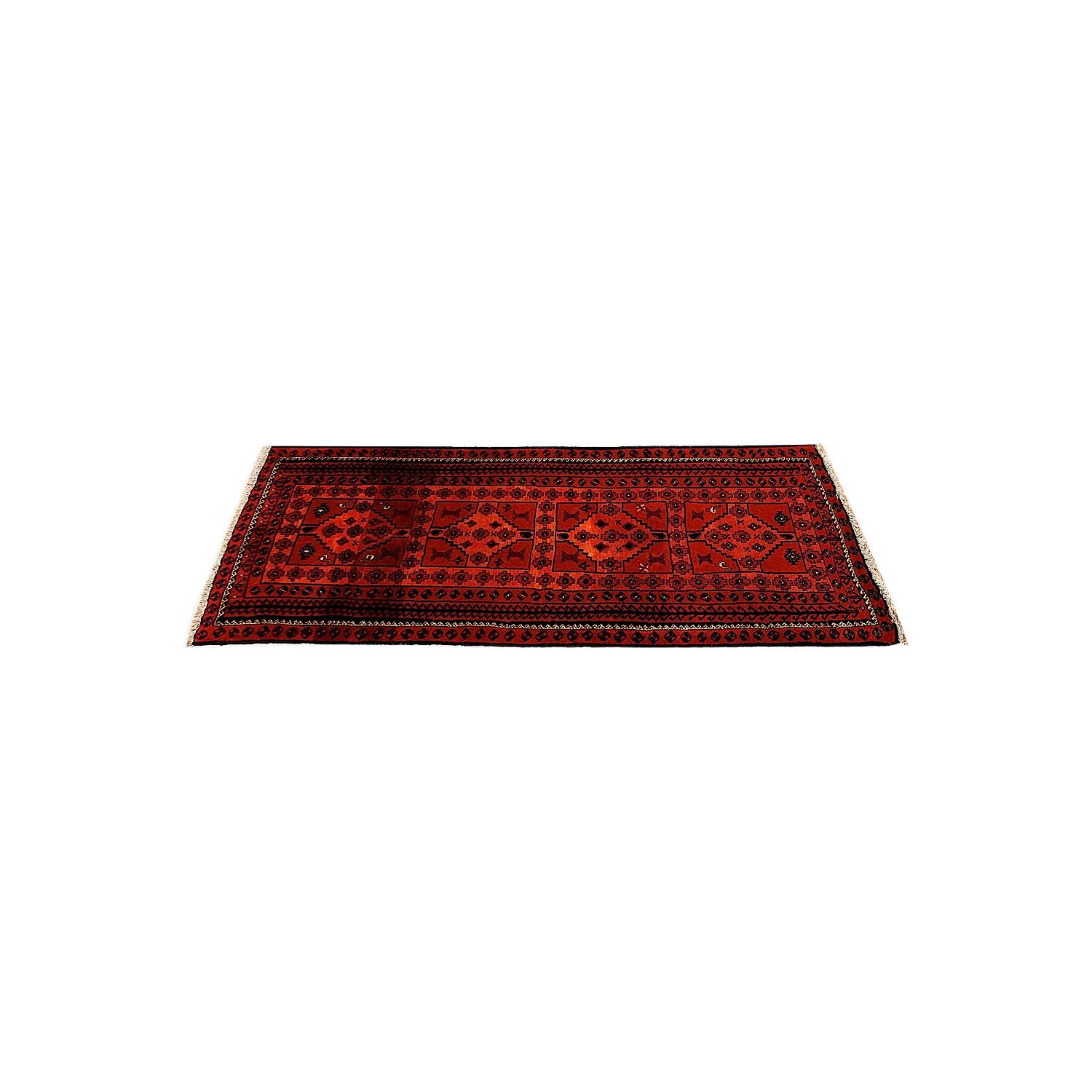 Baluch (or Baluchistan) is a region that includes the Baluchistan province in Pakistan as well as parts of Iran and Afghanistan. These very durable carpets are called Baluchi / Beluchi / Balochi since they are made in this border region; they are usually made of 100% wool and in small sizes, and feature dark red and brown colours and repetitive forms, usually the "gkiua" pattern.